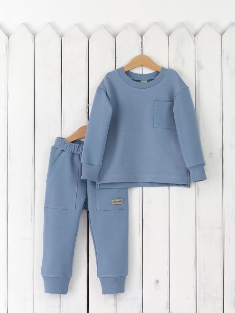 Базовый однотонный комплект из футера 2-нитки (95% хлопок, 5% эластан), состоит из джемпера с накладным карманом и небольшими разрезами по бокам, и брючек с большими накладными карманами и манжетами по низу.