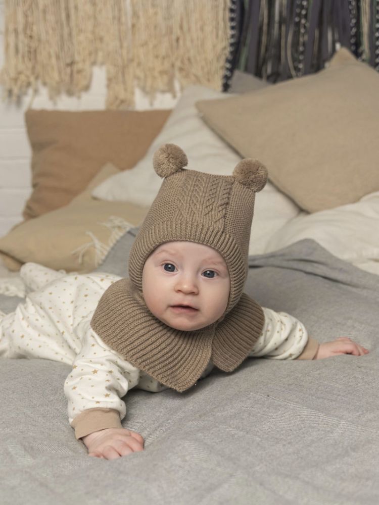 Двойная шапочка с расстегивающейся манишкой. Верхний слой шапки и манишка связаны из полушерстяной пряжи, нижний слой шапочки и манишки выполнен из хлопкового полотна. Можно носить без чепчика. Мягкая резинка вокруг лица не вытягивается в процессе носки и плотно облегает лицо ребенка. Эта шапочка настолько комфортна, что ее можно спокойно снимать даже со спящего малыша, не разбудив его! Модель подходит для холодной осени,весны с капюшоном. Размер равен окружность головы в см. Рекомендации по уходу: машинная деликатная стирка при температуре 30 градусов.